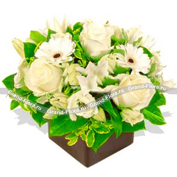«Пинаколада» - это самая грациозная и нежная композиция на оазисе, которая прекрасно сочетает в себе очаровательные белоснежные цветы. В состав «Пинаколады» входят розы, лилии и герберы, окаймленные сочными зелеными листьями.